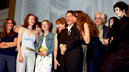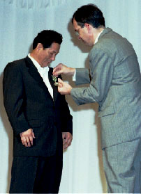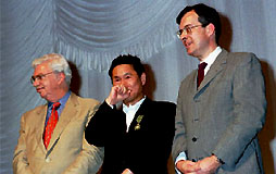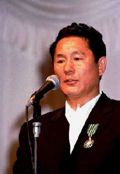 北野武監督 フランス芸術文化勲章受章式レポート 6月12日(土) ヨコハマ グランド インターコンチネンタル ホテル3階ボールホール ![]() 北野武監督 ドキュメント「北野武監督 フランス芸術文化勲章受章式」 司会者 「本日は、お忙しい中、第7回フランス映画祭横浜'99での受章式にお越しいただきまして、大変ありがとうございました。まずは、ユニフランス・フィルム・インターナショナル、ダニエル・トスカン会長を紹介させていただきます。」 ![]() 「第7回フランス映画祭は、このような大事な受章式に、私たちのこのフェスティバルの場をお使いいただいたことに大変感謝しております。そして、この機会にもう一度、横浜市長をはじめ横浜のみなさんに、この7年間このように温かくお迎えいただいていることにお礼を申し上げたいと思います。この7年間で、現在では100を超えるフランスの未公開作品が、日本のみなさまに紹介されました。そして、その中の大部分は、日本でも紹介することができました。しかし、私どもは、フランス映画だけを紹介するためにこちらに来ているのではありません。私どもは、古くから伝統的に紹介されている日本の映画という考え方に、非常に共鳴しております。フランスは、昔から伝統的に、日本の大監督を積極的に迎え入れて参りました。私個人的には、黒澤明監督と一緒に仕事をさせていただいたという経験ももっております。そして、何年か前から、フランスの観客は、日本の新しい監督を見い出し、その監督はフランスでとても愛されております。そして、北野監督の作品を観て、フランスの観客は楽しんでおります。前回のカンヌでも、もうすぐ公開される新しい作品が上映されました。そして、フランスの観客も、そろって北野監督との喜びを分かち合いたいと思っております。それでは、大使においでいただきます。」 司会者 「モーリス・グルド様よりご挨拶を頂戴いたします。そして、ご一緒に北野武監督にもおいでいただきたいと思います。」 会場、拍手。 ![]() 「親愛なる北野武様、こうした形で、横浜の地で、第7回フランス映画祭が行われているときに、フランス政府を代表いたしまして芸術文化勲章をお渡しできますことを、とても喜びと感じております。 北野監督は、まさしく日本の新しい映画を作られた監督と理解しておりますが、それは、どのように形容すればいいのか、次のような言葉がよく使われております。まずは、大変に人気のある伝統破壊者。また、時には、無政府主義者として、また、なぜか意図せずに映画製作者になってしまわれたこと、これはまわりの方ばかりではなくて、ご本人もよく言っておられるわけです。しかしながら、日本では、先ほど私が紹回いたしました「赤信号みんなで渡ればこわくない」というように、大変人気のある一面があると私どもは理解しております。 日本のみなさまにとっては、むしろ、ビートたけしさんとして有名かもしれません。そして、何事にも許容力のあるところで、まずは、漫才から始められたわけですが、今では、テレビでは欠かせない存在となりました。もちろん、司会者として、本当にテレビで拝見しない日はない。北野チャンネルというものがあるほど、毎日活躍しておられます。 ![]() それからというもの、『その男、狂暴につき』から『HANA-BI』まで、多くのものを私どもは楽しむことができたわけですが、この中には、いくつかの共通性があろうかと思います。まず、独自の手法、固定のカメラによる長いシーン、また、特別な省略手法、そしてまた、その中の予期せぬ暴力、狂暴性、優しさ、道化と、そういったものすべてがなぜか盛り込まれた、とても魅力的なものと私どもは理解しております。また、映画の中に出てくる俳優というのは、冷淡な役を演じることがあるかもしれません。それは、ある意味では、自分の死に直面していることもあるでしょうし、大きなことをやろうとして失敗して、悲しそうに海辺に立っているという場面もありました。そうしたものすべてに、私どもが感動いたしましたのには、常に、音楽を担当しておられた、久石氏の音楽もあったのだろうと思います。いずれにいたしましても、フランス人の私どもの感性にも訴えるものがありました。 そして、8番目の作品となりました『菊次郎の夏』は、多くの期待を受けて、カンヌ映画祭で公開されたわけです。そして、今までとは全く違うものを観客は見い出すことができ、また、感動を覚えたのではないかと思います。そこには、北野監督ご自身の特別な技法、また、特殊効果にどこかたよりがちなアメリカ映画とは異なったものを目指していきたいという気持ちを強く感じました。そして、映画監督としての批評は、ご自身でも謙遜されて決して評価してらっしゃらないのでありますが、多くの日本の巨匠と並ぶものと私自身は、確信しているのであります。ですから、こうして開催されている横浜