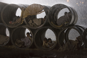 ツォツィは赤ん坊を入れた紙袋を持って、土管が並ぶ丘の上へ行った。土管の中には貧しい身なりの子どもたちが住み着いている。ツォツィも昔、1人でここに流れ着いた時、土管を住処にしていたのだった。